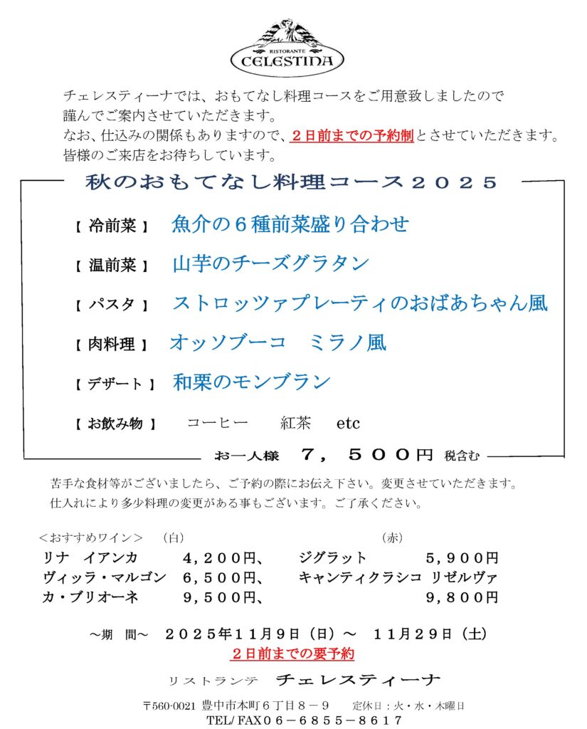 リストランテ チェレスティーナ 豊中市本町6丁目8-9 TEL06-6855-8617