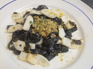 | ●イカ墨のフェットチーネ イカとドライトマトのにんにくオイル風味 焼きパン粉添え |