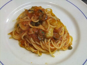 | ●スパゲッティ ナス入りプッタネスカ(黒オリーブ、ケッパー、赤唐辛子、トマトソース) |