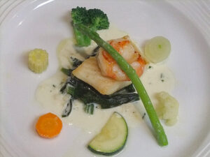 | ●鯛とエビのポワレ 白ネギの白バターソース |