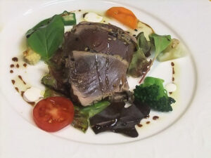 ●カツオのゴマ風味のタタキ 焼きナス添えバルサミコソース